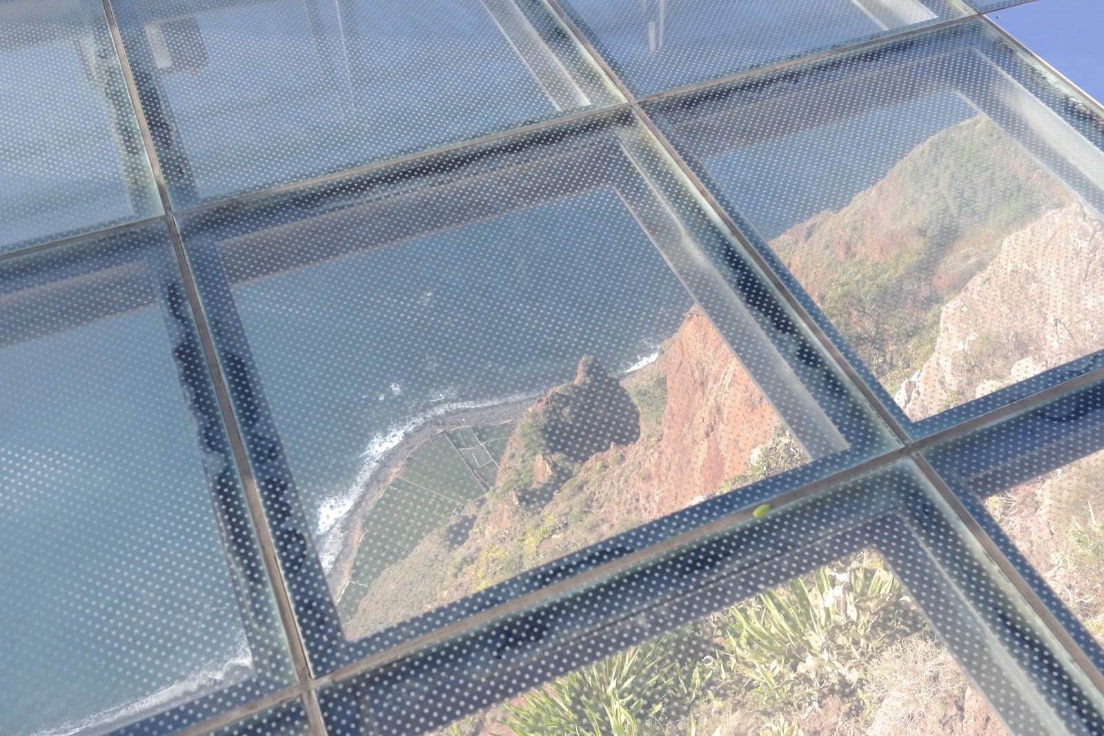 Seuraavana nähtävyytenä oli Cabo Girao. Auto parkkiin ja kokeilemaan tätä lasilattiaista näköalatasannetta. Samaan aikaa paikalla oli nuori pari, josta mies ei uskaltanut kävellä lasin päälle ollenkaan ja nainenkin vain äkkiä käveli lasin sisäreunasta yli. Meidän oli siis melkein kuin pakko reteästi tietysti vaan kerralla mentävä lasille. Otimme kuvia innoissamme ja kohta huomasimme kuinka lasissa oli muutamassa kohdassa halkeamia. Olikohan joku yrittänyt rikkoa lattiaa vai oliko vaan hauska jekku. Kun olimme lähdössä pois, paikalle pelmahti bussillinen väkeä. Hyvään aikaan osuttiin paikalle siis.